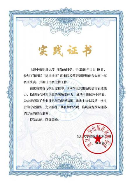 近日,第四届“复旦社杯”职业院校英语影视剧配音大赛决赛圆满落幕。作为全国极具影响力的英语语言类赛事,本届大赛以“声传文化,语通世界”为主题,吸引了全国百余所院校的优秀学子同台竞技。值得关注的是,来自上海中侨职业技术大学应用英语专业大三学生汪劭函,以主持人的身份站上了决赛舞台——而就在一年前,他还是第三届大赛中斩获佳绩的参赛选手。