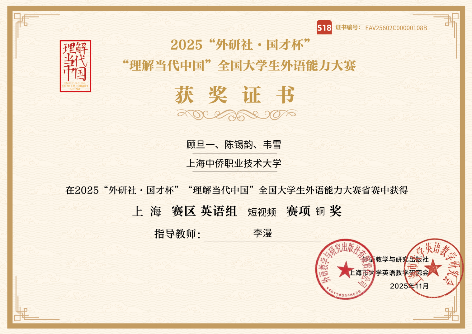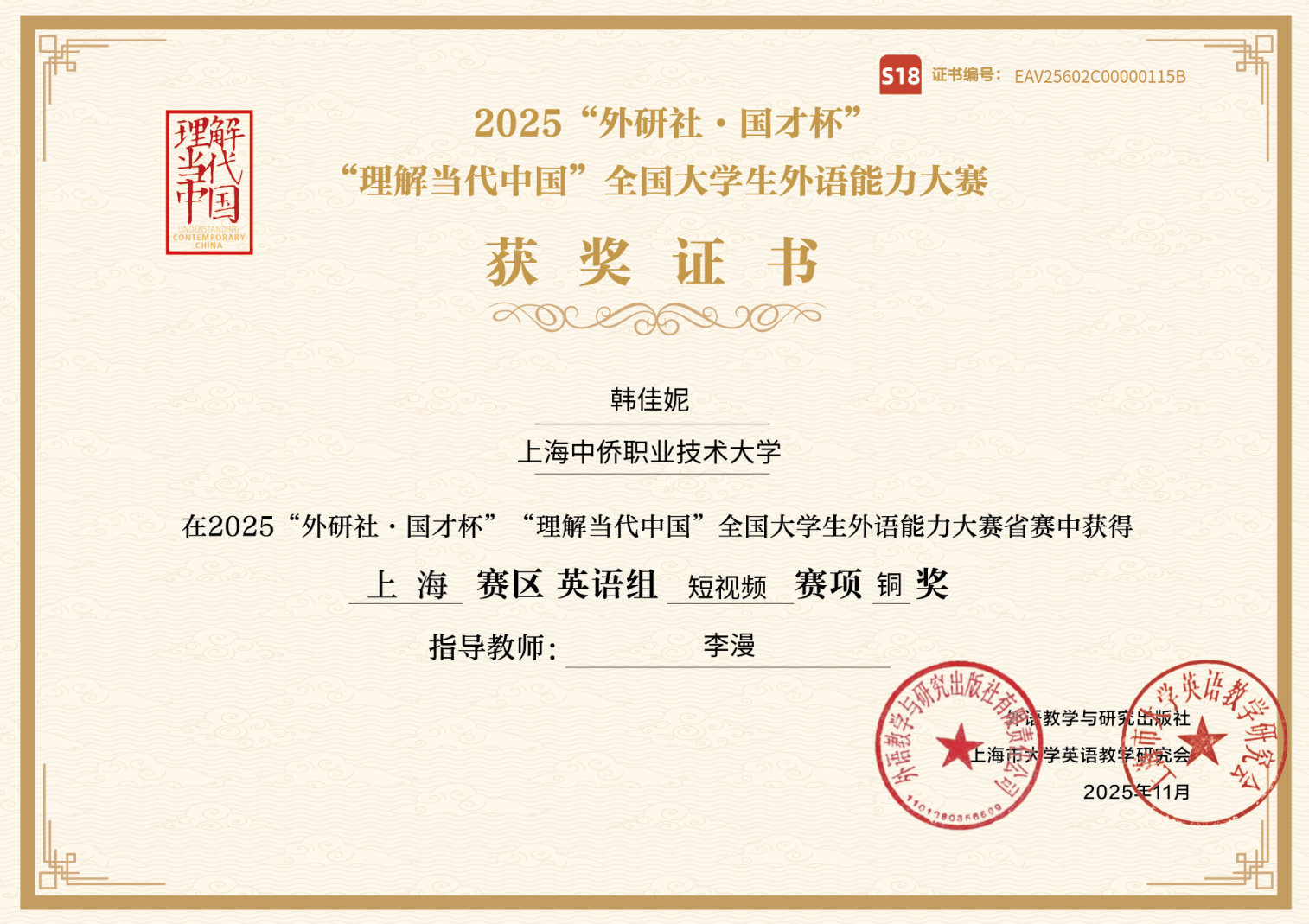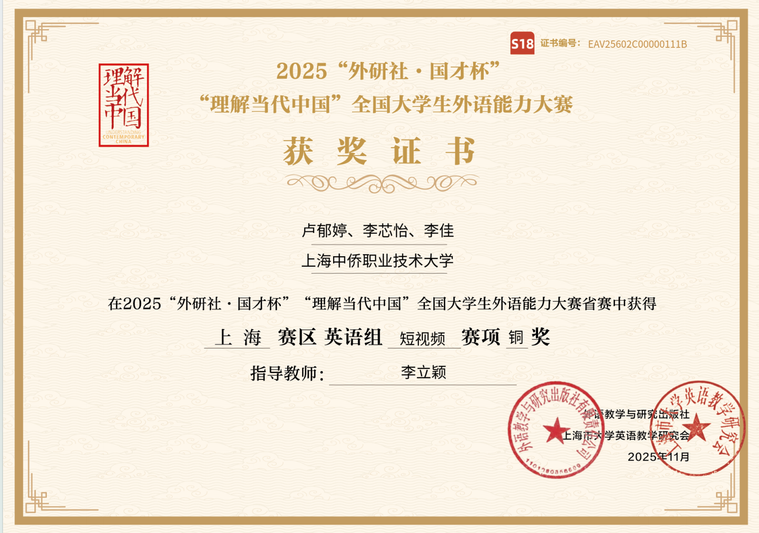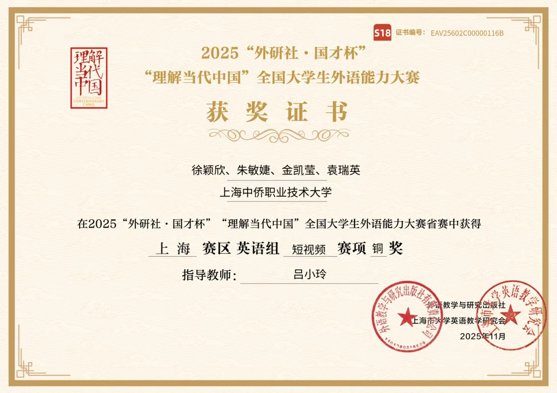 近日,2025“外研社・国才杯”“理解当代中国” 全国大学生外语能力大赛上海赛区结果正式揭晓,我校外国语学院学子在英语组短视频赛项中表现亮眼。本次赛事我校共组织14名学生组成 5 组作品参赛,5 组作品悉数晋级市赛并全部斩获铜奖,用实力彰显了我校外语教学的扎实成效。